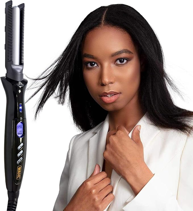 The Wahl Root Straightening Hot Comb effortlessly smooths kinks and frizz from the roots, ideal for coarse, curly, frizzy, and Afro-Caribbean hair types, as well as wigs. Its ceramic-coated barrel locks in moisture for a smooth, shiny finish, while the fine-tooth comb protects the scalp. With variable heat settings from 100°C to 220°C displayed on an LCD screen, it allows precise styling for all hair textures and thicknesses. The hot comb heats in just 60 seconds and features a 3m 360° swivel cord for easy, flexible use.